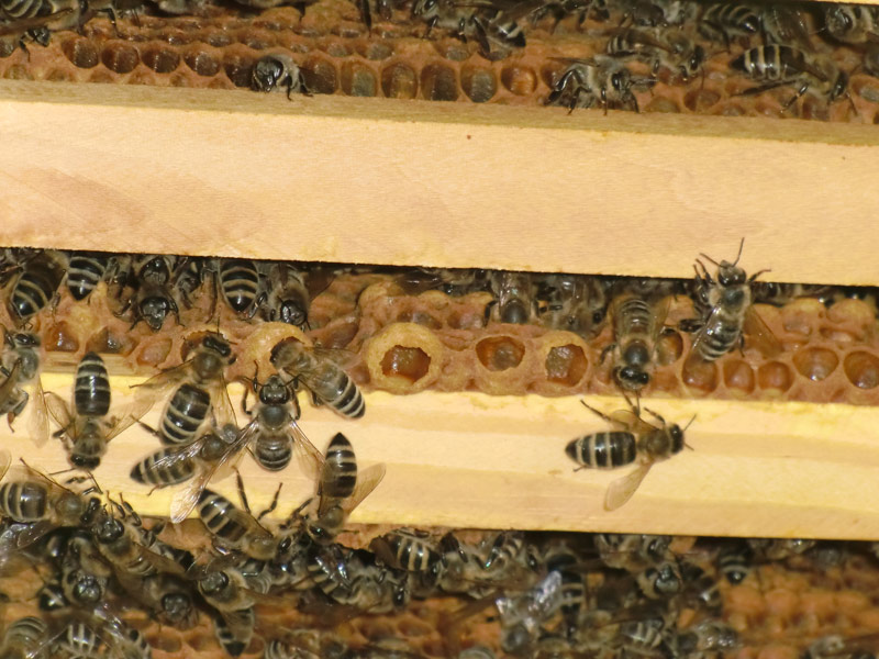 Die Biene in unseren Stöcken ist übrigens Carnika (Apis mellifera carnica Pollmann, 1879), auch Kärtner oder Karpaten Biene genannt. Sie stammt, wie letztere Namen suggerieren, aus dem südöstlichen Österreich bzw der Balkan Region. Carnica ist eine natürlich entstandene Unterart der Westlichen Honigbiene (Apis mellifera) und mittlerweile nicht nur in Deutschland, sondern auch weltweit verbreitet. Da sie besonders große Völker bildet, ist der Ertrag oft ergiebiger als bei anderen Honigbienen. Wichtig für uns ist aber auch die Tatsache, dass die Carnica eine sehr sanftmütige Biene ist.
