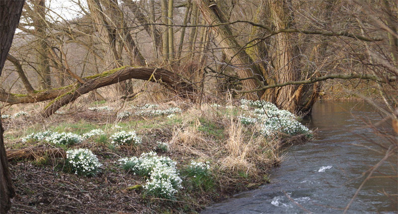 Der Frohnbach macht's möglich. Zahlreiche Haselnusssträucher und Silberweiden säumen die Ufer des weitgehend in einem ursprüglichen Bett fließenden Bachlaufs. Wenn das Wetter entsprechend ist, blüht die Haselnuss bereits im Januar. Für die Bienen ein fliegender Start. Dann folgen im Februar Schneeglöckchen und Salweiden; erstere haben sich an manchen Uferbereichen geradezu flächendeckend verbreitet. Mit dieser Tracht gelingt es den Bienen die bangen ersten Frühjahrsmonate zu überbrücken, ohne von uns Menschen mit zusätzlichem Aufbaufutter versorgt werden zu müssen.